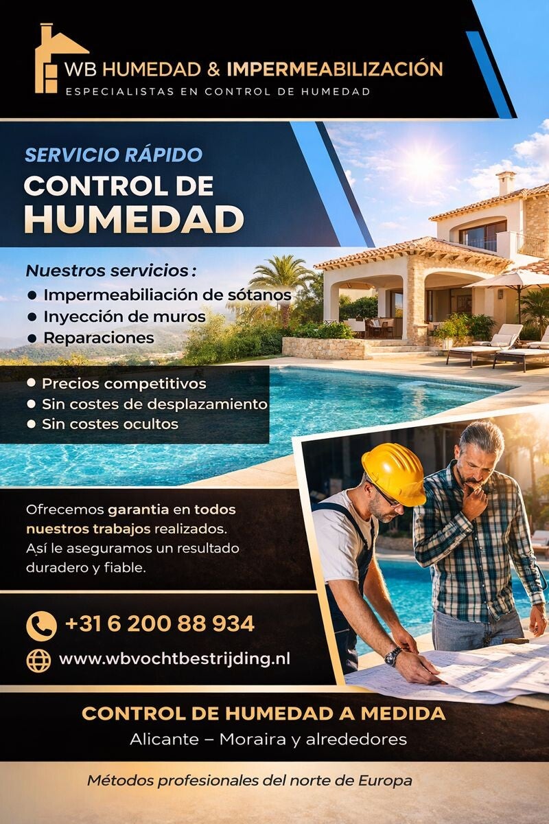 Many homes in Spain, including Moraira, suffer from damp problems due to damp bricks, which often leads to unpleasant odors. Our service offers a fast and professional approach. No call-out charges, always a free inspection, and a no-obligation quote. Furthermore, you can benefit from the reduced 9% VAT rate on damp control and potentially save money by working with your neighbors. With our expertise, you are guaranteed a sustainable solution.